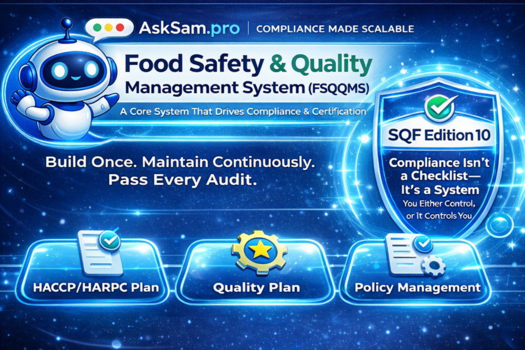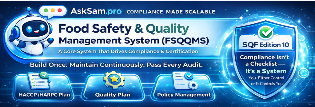 In today’s food manufacturing environment, achieving SQF Edition 10 certification is no longer just a regulatory milestone—it’s a business necessity. Retailers, distributors, and government buyers increasingly require suppliers to demonstrate not just compliance, but systemized, repeatable, and scalable food safety and quality management systems. Yet many companies still approach SQF as a documentation exercise rather than what it truly is: A fully integrated management system. At AskSam.pro (Systems Assistant Manager), in collaboration with FoodSafetySystems.pro, we help businesses transform SQF compliance into a living, operational system—one that works every day, not just during audits.